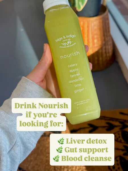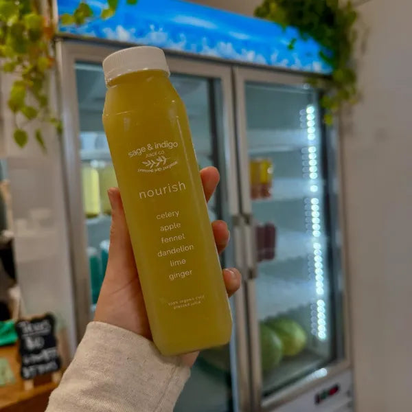 Introducing NOURISH, an all-natural juice crafted to revitalize and rejuvenate. This refreshing blend combines the crisp freshness of celery and apple with the aromatic essence of fennel and the detoxifying benefits of dandelion. A splash of lime adds a zesty brightness, while a hint of ginger provides a warming kick for a balanced and invigorating flavor profile.